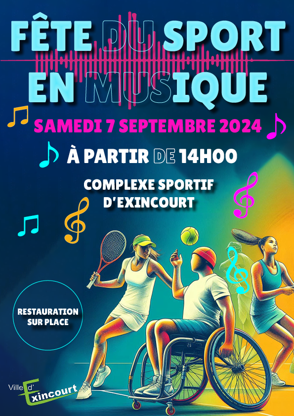 Le samedi 7 septembre, le complexe sportif d'Exincourt s'animera pour célébrer, comme chaque année, la Fête du Sport en Musique. Au programme, découverte des associations de la commune, animations musicales, structures gonflables et bien plus encore ! Nous vous attendons nombreux pour célébrer, tous ensemble, la Fête du Sport en Musique !