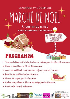Les festivités de fin d’année approchent et, comme chaque année, le Marché de Noël organisé par les parents d’élèves de l’école élémentaire Victor-Hugo promet un moment chaleureux et convivial. L’événement se tiendra vendredi 19 décembre à partir de 16h30, à la salle Brodbeck d’Exincourt.