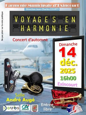 L’Harmonie Municipale d’Exincourt donnera son concert d’automne le dimanche 14 décembre 2025, à 16h, à la salle André Augé.